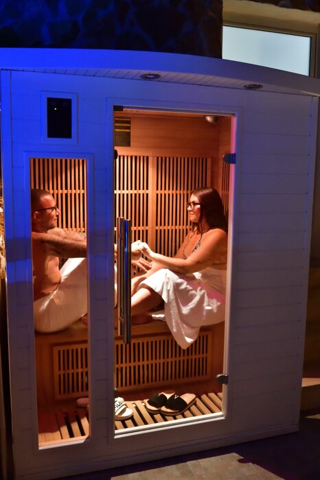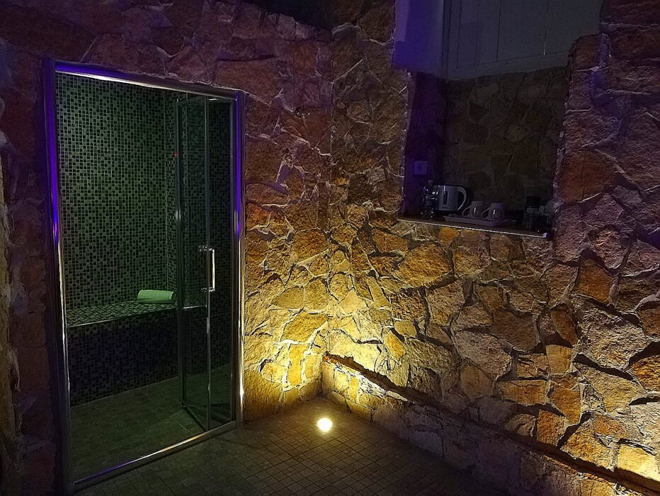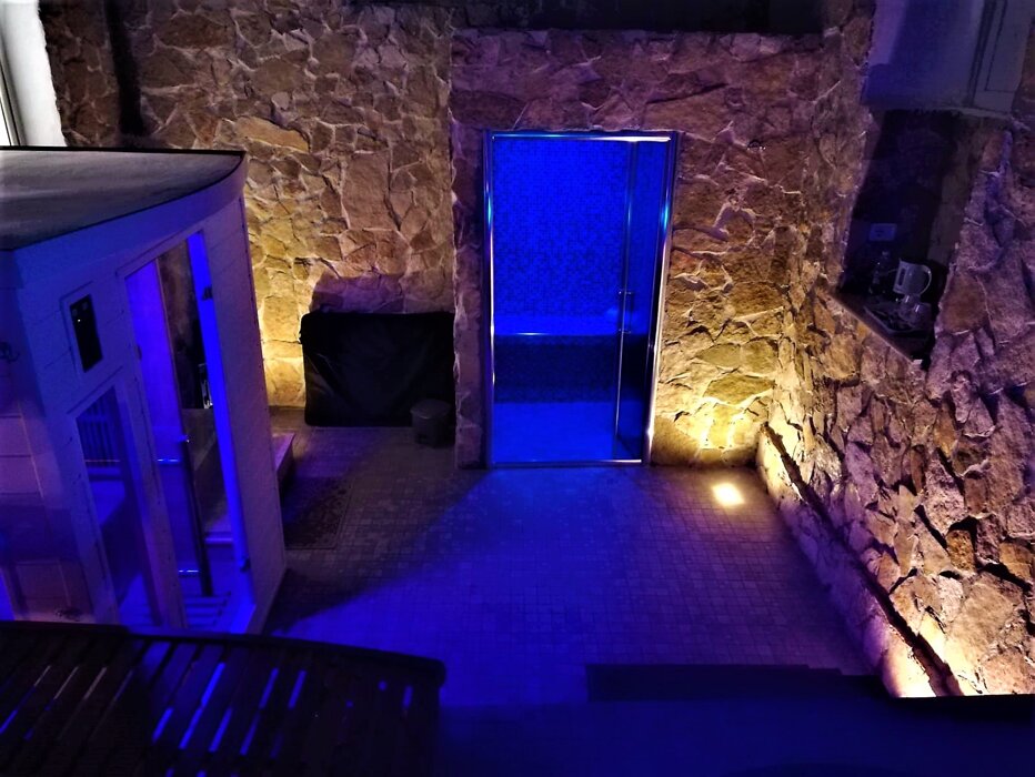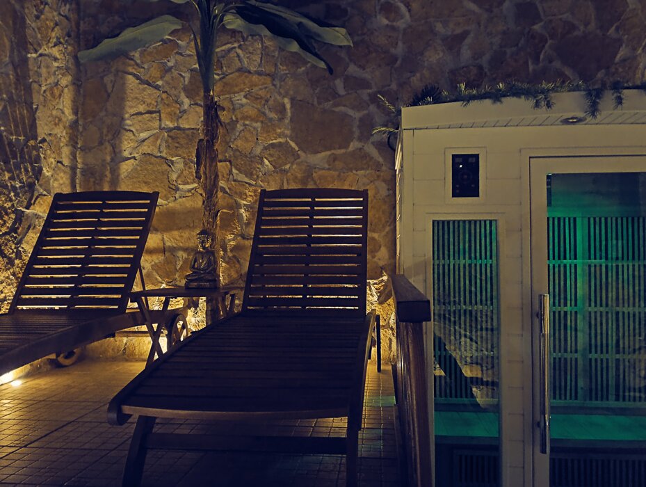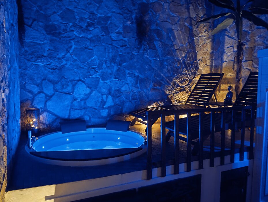 La parete rocciosa, avvolta dalla vegetazione e impreziosita da una cascata naturale, domina la zona relax: qui, il suono dell’acqua che scorre accompagna il riposo su confortevoli lettini ergonomici, offrendo un momento di pura rigenerazione.